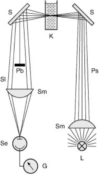 Das in der Laser-Nephelometrie verwendete Meßgerät wird als Laser-Nephelometer bezeichnet. Die Abb. zeigt eine schematische Darstellung eines solchen Geräts. Als Strahlungsquelle dienen Leuchtdioden (L) oder Halogenlampen. Durch ein Mikroskopobjektiv (Sm) wird ein Primärstrahl (Ps) erzeugt, der über einen Umlenkspiegel (S) so umgeleitet wird, daß er auf die Küvette (K), welche die Analysenlösung enthält, fällt. Durch die sich in Lösung befindenden Antigen-Antikörper-Komplexe wird das Licht in einer charakteristischen Weise kegelförmig gestreut. Die Intensität des Streulichts (Sl) hängt von der Wellenlänge und der Intensität des Primärstrahls, von der Konzentration der Antigen-Antikörper-Komplexe, deren Durchmesser sowie vom Unterschied der Brechungsindizes der Komplexe und des Analysenmediums ab. Das Streulicht und das Restlicht des Primärstrahls werden durch einen zweiten Umlenkspiegel (S) auf eine Blende (Pb) umgeleitet, die das Licht des Primärstrahls auffängt. Das verbleibende Streulicht wird durch einen Detektor (Se Strahlungsempfänger) aufgefangen und nach dem photometrischen Prinzip analysiert (G Galvanometer mit Meßwertanzeige), wobei das Endpunktverfahren, die kinetische Methode und die fixed-time-Messung (Messung zu zwei definierten Zeitpunkten und Bestimmung der Extinktionsdifferenz) zur Anwendung kommen.