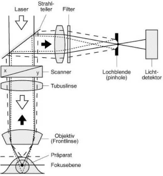 Schematische Darstellung eines Laser-Scan-Mikroskops. Laserlicht wird über einen Scanner durch die Linsen eines Objektivs beugungsbegrenzt auf das Präparat fokussiert. Reflexions- bzw. Emissionslicht aus der Fokusebene und aus darunter- bzw. darüberliegenden Ebenen gelangt über den Scanner zu einem Strahlteiler, wo es aus dem Laserstrahlengang ausgekoppelt wird. Dieses ausgekoppelte Licht wird auf eine extrem kleine Blende (pinhole) fokussiert und trifft nach dem Blendenausgang auf ein Detektionssystem. Aus den im Bild dargestellten Strahlenverläufen des Reflexions- bzw. Emissionslichts wird ersichtlich, daß bei entsprechender Position des pinholes nur Licht aus der Fokusebene die Blende passieren kann, während Licht aus anderen Ebenen des Präparats wirksam unterdrückt wird.