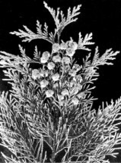 Lebensbaumzypresse, Weißzeder, Scheinzypresse, Chamaecyparis, Gattung der Zypressengewächse mit 6 Arten in Nordamerika und Ostasien; allgemein sehr ähnlich dem Lebensbaum, ♀ Zapfen ( vgl. Abb. ) jedoch mit schildförmigen, wie Klappen schließenden Schuppen. Chamaecyparis nootkatensis („Nutkazypresse"; Nadelhölzer II) und Chamaecyparis lawsoniana („Oregonzeder") sind wichtige, gutes Bauholz liefernde Bäume der Nadelwälder des pazifischen Nordamerika und sind in Europa beliebte Ziergehölze (vor allem letztere mit zahllosen Kultursorten). In Japan und auf Taiwan gedeiht die wegen ihres dauerhaften, zähen Holzes auch forstlich intensiv kultivierte Chamaecyparis obtusa („Feuerzypresse") vor allem in Höhen zwischen 500 und 1000 m.