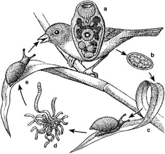 Entwicklungsgang des Saugwurms Leucochloridium macrostomum mit der Bernsteinschnecke als Zwischenwirt und Kleinvögeln als Endwirte; a geschlechtsreife Saugwürmer in der Kloake des Vogels, b die Eier gelangen mit dem Vogelkot nach außen, c die Eier werden von der Bernsteinschnecke mit der Nahrung aufgenommen, d in der Schnecke entwickeln sich die Sporocysten, e die reifen Brutschläuche werden vom Vogel aus den Schneckenfühlern gerissen.