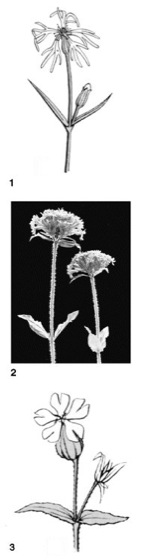 1 Kuckucks-Lichtnelke (Lychnis flos-cuculi),2 Brennende Liebe (Lychnis chalcedonica),3 Weiße Lichtnelke oder Nachtnelke (Melandrium album)