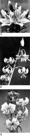 1 Feuer-Lilie (Lilium bulbiferum),2 Türkenbund (Lilium martagon),3 Harlekin-Hybriden