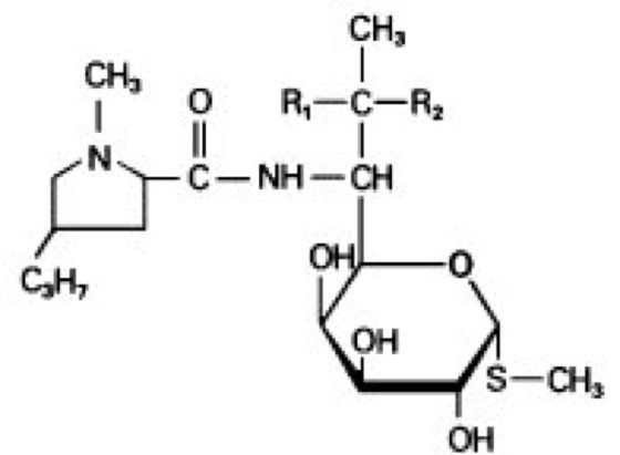 Lincomycins, Antibiotikum aus Kulturen von Streptomyces lincolnensis mit Wirkung gegen grampositive Bakterien, insbesondere Kokken. Lincomycin besteht aus einer mit einem N-Methylprolin-Derivat (Propylhygrinsäure) substituierten Aminooctose. Es bindet, ähnlich wie Erythromycin, an die 50S-Untereinheit der 70S-Ribosomen und hemmt dadurch die bakterielle Protein-Biosynthese. Größere therapeutische Bedeutung als Lincomycin hat sein halbsynthetisches Derivat Clindamycin ( vgl. Abb. ), das sich durch bessere und raschere Resorption sowie ein breiteres Wirkungsspektrum auszeichnet.