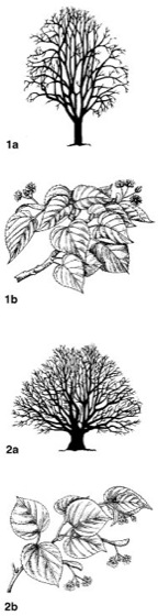 1 Winter-Linde (Tilia cordata), 2 Sommer-Linde, Großblättrige Linde (Tilia platyphyllos, Tilia grandifolia); a Wuchsformen, b Blatt, Blüte und Frucht