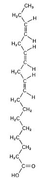 Linolensäure [von *lino- ], Octadecatriensäure, C18H30O2, anionische Form: Linolenat, ungesättigte Fettsäure mit 3 cis-Doppelbindungen; je nach Lage der Doppelbindungen unterscheidet man α-(Δ9,12,15) und γ-Linolensäure (Δ6,9,12). Linolensäure ( ä vgl. Abb. ) kommt in hoher Konzentration in Leinöl (Name!) und Hanföl vor; sie spielt im menschlichen, tierischen und pflanzlichen Organismus zusammen mit Linolsäure beim Lipoidaufbau (Fette, Lipide) und der Synthese von Prostaglandinen und Prostacyclin eine wichtige Rolle. Vom Säugerorganismus können Linolensäure und Linolsäure nicht synthetisiert werden, weshalb beide zu den essentiellen Fettsäuren zählen. Jasmonate, Membran.