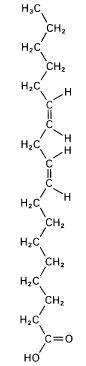 Linolsäure [von *lino- ], Octadecadiensäure, Leinölsäure, C18H32O2, ungesättigte Fettsäure ( ä vgl. Abb. ) aus Höheren Pflanzen, Tieren und dem menschlichen Organismus mit 2 cis-Doppelbindungen. Linolsäure kommt u.a. zu ca. 15% im Leinöl und Olivenöl, mit ca. 66% im Sonnenblumenöl und zu ca. 14% im Schweinefett vor. Eine für die Ernährung bedeutende essentielle Fettsäure, fungiert sie als Vorstufe für die Arachidonsäure. Linolsäure ist Bestandteil von Phospholipiden und Prostaglandinen und hat eine senkende Wirkung auf den Blut-Cholesterinspiegel (Cholesterin). Das Glycerid der Linolsäure findet sich in trocknenden und halbtrocknenden Ölen. Linolensäure, Membran, Omega-3-Fettsäuren.