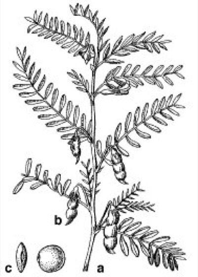Speise-Linse (Lens culinaris),a blühende und fruchtende Pflanze, b Hülse, c Samen