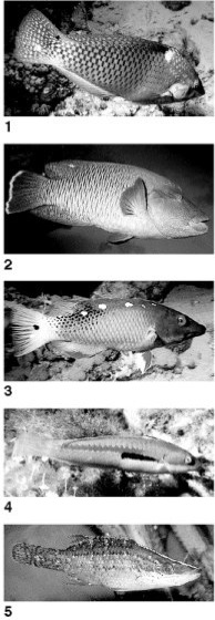1 Blaukopf-Kaiserfisch (Pomacanthus xanthometopon, Malediven), 2 Napoleon-Lippfisch (Cheilinus undulatus, Rotes Meer), 3 Dianas Schweinslippfisch (Bodianus diana, Rotes Meer), 4 Meerjunker (Coris julis, Mittelmeer), 5 Schnauzenlippfisch (Crenilabrus scina, Mittelmeer)