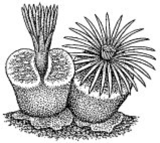 Lithopsw [von *lith- , griech. ops = Anblick], Lebende Steine, Gattung der Mittagsblumengewächse mit ca. 35 Arten in den Trockengebieten Südafrikas. Sukkulente Pflanzen mit Pfahlwurzel, einem kurzen, unterirdischen Erdstamm und nur 1 Paar dicker, halbkreisförmiger, meist graugrüner Blätter. Letztere sind bis auf einen Spalt verwachsen, aus dem jeweils nur 1 oft recht große, strahlenförmige, gelbe oder weiße Blüte hervorgeht. Nach der Blüte stirbt das Blattpaar ab und wird durch ein neues ersetzt. Die bis etwa 5 cm großen Lebenden Steine sind in der Natur bis auf die eher flache, lichtdurchlässige, einfarbige oder rostrot und dunkelbraun gemusterte Oberseite im Boden versenkt (Fensterblätter) und sehen den Steinen, zwischen denen sie wachsen, täuschend ähnlich („Mimikrypflanzen"). Arten wie Lithops karasmontana oder Lithops lesliei ( vgl. Abb. ) sind häufig in Sukkulentensammlungen zu sehen. Die Bezeichnung „Lebende Steine" wird zum Teil auch auf verwandte Gattungen angewendet.