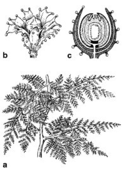 Lyginopteris oldhamia aus dem Oberkarbon: a Rekonstruktion des Stamms mit Laubblättern, b Samen mit Hüllbecher, c Samen im Längsschnitt