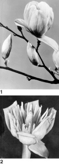 1 Blüte einer Magnolie (Magnolia spec.), 2 Blüte des Tulpenbaums (Liriodendron tulipifera)
