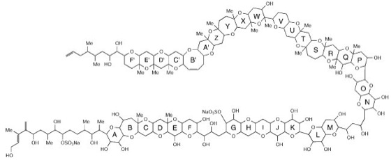 Maitotoxins, von Dinoflagellata gebildetes, wasserlösliches und hochtoxisches Algengift ( vgl. Abb. ), das über die Nahrungskette angereichert wird und beim Menschen langanhaltende Vergiftungserscheinungen hervorruft. Symptome sind Herz-Kreislauf-Beschwerden, Magen-Darm-Verstimmung, Juckreiz sowie eine Umkehr der Heiß-Kalt-Empfindung. Tödliche Vergiftungen sind selten, da Maitotoxin nur in sehr geringen Mengen in Fischen enthalten ist.
