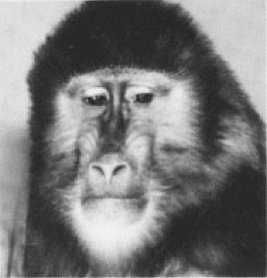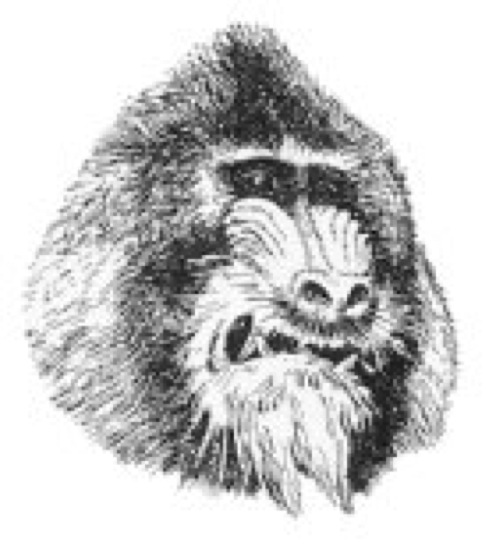 Abb. 2: Freundliche Grußmimik des Mandrills (herabgezogene Lippenwinkel und Zeigen der Eckzähne), die früher als Drohmimik interpretiert wurde.