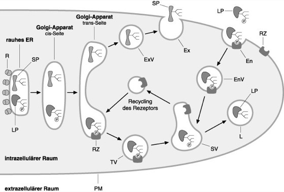 Schematische Darstellung der Funktion und des Lebenszyklus des Mannose-6-phosphat-Rezeptors. Die am rauhen endoplasmatischen Reticulum (ER) gebildeten Proteine (z.B. Sekretproteine, lysosomale Proteine) werden im Golgi-Apparat (cis-Seite) für den Weitertransport vorbereitet (Phosphorylierung der lysosomalen Proteine an Mannose-Resten). Ebenfalls im Golgi-Apparat (trans-Seite) binden die phosphorylierten Proteine an den Mannose-6-phosphat-Rezeptor (RZ). Nicht phosphorylierte Sekretproteine (SP) werden in Exocytosevesikel (ExV) verpackt und exocytiert (Ex). Die an den Rezeptor gekoppelten Proteine werden in Transportvesikeln (TV) durch die Zelle transportiert. In der Sortiervesikel (SV) löst sich das Protein durch Erniedrigung des pH-Werts vom Rezeptor ab. Der Rezeptor wird recyclisiert. Versehentlich exocytierte lysosomale Proteine (LP) werden endocytiert (En) und dem Zyklus über Endocytosevesikel (EnV) wieder zugeführt. L Lysosom, PM Plasmamembran, R Ribosom.