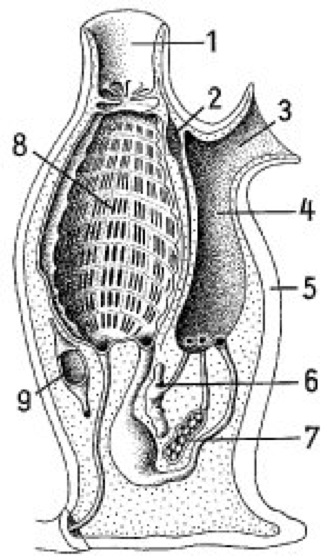 Längsschnitt durch eine Seescheide: 1 Einstromöffnung, 2 Ganglion, 3 Ausstromöffnung, 4 Peribranchialraum, 5 Mantel, 6 Hoden, 7 Ovar, 8 Kiemendarm, 9 Herz, 10 After