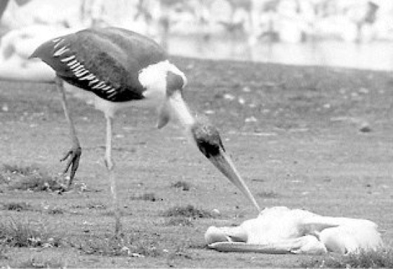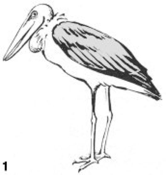 Marabus [über franz. marabout von arab. murābit = Einsiedler], Leptoptilos, Gattung aasfressender Störche der Tropen ( vgl. Abb. 1 und vgl. Abb. 2 .); in Anpassung an die Ernährungsweise sind ähnlich wie bei Geiern Kopf und Hals fast kahl; jagen gelegentlich auch lebende Vögel, z.B. Flamingos. Mit dem mächtigen, keilförmigen Schnabel wird die Bauchdecke toter Tiere aufgehackt. Ein nackter Hautsack am Hals dient bei der Balz als Schauapparat. Die Marabus leben in wildreichen Gebieten und im Bereich menschlicher Siedlungen; brüten in umfangreichen Nestern kolonieweise auf Bäumen oder Felsen. Größte der 3 Arten ist der Indische Marabu (Leptoptilos dubius) mit einer Höhe von 1,50 m und einer Flügelspannweite von ca. 3 m. Der Javanische Marabu oder Sunda-Marabu (Leptoptilos javanicus) kommt in Mittelindien bis Java und Borneo vor. Der Afrikanische Marabu (Leptoptilos crumeniferus;Afrika I ) legt seine 2 bis 3 Eier zu Ende der Regenzeit ab, um seine Jungen in der aasreicheren Trockenzeit aufzuziehen; die Jungen verlassen nach 4 bis 5 Monaten den Horst.