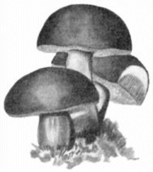 Maronenröhrling, Marone, Braunhäuptchen, Xerocomus badius Gilb., häufiger, eßbarer, schmackhafter Filzröhrling ( ö vgl. Abb. ); er hat aber ein hohes Speichervermögen für (radioaktives) Cäsium (137Cs), so daß (wegen des Reaktorunfalls von Tschernobyl, 1986; Strahlenbelastung) in einigen Teilen Deutschlands immer noch davon abgeraten wird, höhere Mengen von diesem Pilz zu verzehren. Der Hut ist kastanien- bis schokoladenbraun, jung filzig samtig, alt oder naß etwas schmierig (4–15[20] cm); die Poren sind grüngelblich, das Fleisch weißlich, mehr oder weniger blauend. Er kommt von Juli bis November hauptsächlich im Nadelwald, bevorzugt auf Sandboden, vor; Pilze III.