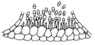 Acervulus von Marssonina rosae (Diplocarpon rosae) mit zweizelligen Konidien
