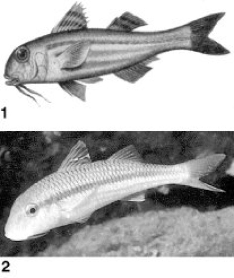 1 Rote Meerbarbe (Mullus barbatus),2 Gestreifte Meerbarbe (Mullus surmuletus)