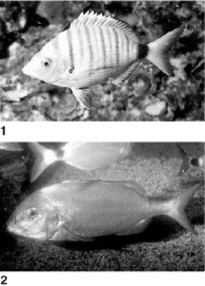 1 Spitzbrasse (Diplodus [= Charax] puntazzo), 2 Rotbrasse (Pagellus erythrinus), beide Mittelmeer
