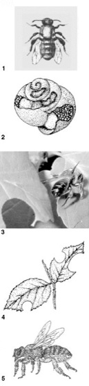 1 Mauerbiene (Osmia spec);2 Nestanlage von Osmia bicolor im Schneckenhaus; 3 Weibchen der Blattschneiderbiene Megachile willughbiella beim Blattschneiden; 4 Ausschnitte aus Blättern von einer Blattschneiderbiene (Megachile spec.),5 Bauchsammelbiene mit Bauchbürste