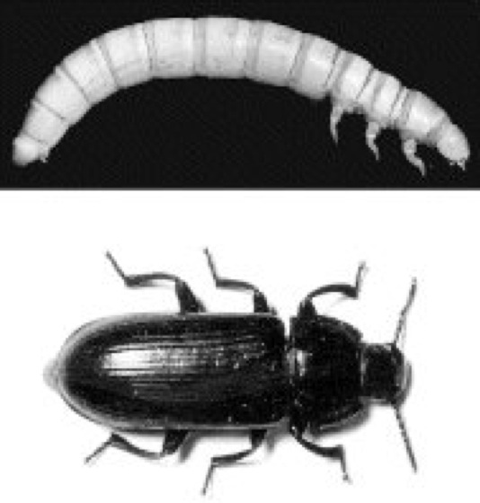 Mehlkäfer, oben Larve („Mehlwurm“)