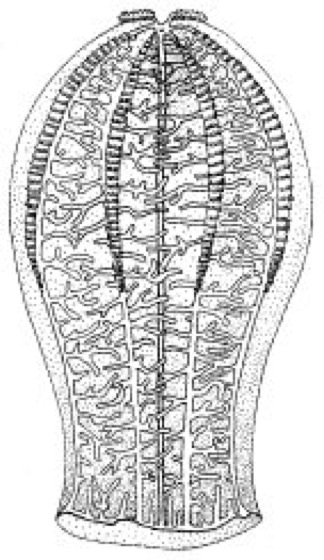 Melonenquallen, Beroe, weltweit verbreitete Gattung der Atentaculata mit mützenförmigem („Mützenquallen“), seitlich zusammengepreßtem Körper ( vgl. Abb. ). Die Mundöffnung ist sehr groß und führt in einen weiten Schlund, der fast den ganzen Körper ausfüllt. Melonenquallen ernähren sich ausschließlich von anderen, oft spezifischen Rippenquallen, die mit dem weit geöffneten Mund gegriffen (Beute kann doppelt so groß sein wie der Räuber!) und mit der kräftigen Schlundmuskulatur verschluckt werden. Im Schlund wird die Beute mit Gift aus speziellen Drüsen gelähmt. Der eigentliche Magen ist sehr klein und liegt unter dem aboralen Pol; von ihm ziehen die Längsgefäße in den Körper, die sich stark verzweigen und vernetzen (Gastrovaskularsystem). Die weißlichrosa gefärbte, 10 cm hohe Beroe ovata lebt im Mittelmeer, wo sie oft in Schwärmen auftritt; sie leuchtet intensiv blaugrün. Beroe cucumis wird bis 16 cm hoch, ist rosafarben und ein Kosmopolit. Sie frißt ausschließlich Bolinopsis (Lobata). Beroe gracilis lebt in der Deutschen Bucht endemisch und frißt ausschließlich Pleurobrachia pileus (Seestachelbeere).