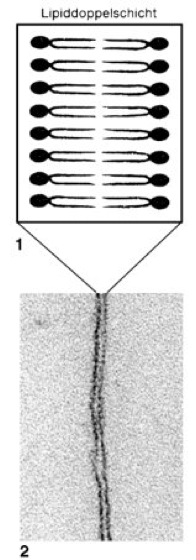 1 Strukturelles Grundelement aller Biomembranen ist eine Doppelschicht aus amphipolaren Lipidmolekülen (Lipiddoppelschicht). Ovale symbolisieren polare Kopfgruppen (Phosphatgruppen und polare Reste), „Schwänze“ unpolare Schwanzgruppen aus Fettsäureresten. 2 Elektronenmikroskopische Aufnahme einer Biomembran mit der typischen trilamellaren Struktur („unit membrane“): 2 etwa 2 nm dicke dunkle Linien schließen eine ca. 3 nm dicke helle Linie ein.