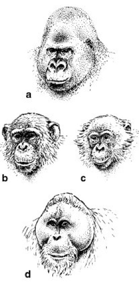 Abb. 1: Köpfe der Großen Menschenaffen: a Gorilla (Gorilla gorilla),b Schimpanse (Pan troglodytes),c Bonobo, „Zwergschimpanse“ (Pan paniscus),d Orang-Utan (Pongo pygmaeus)