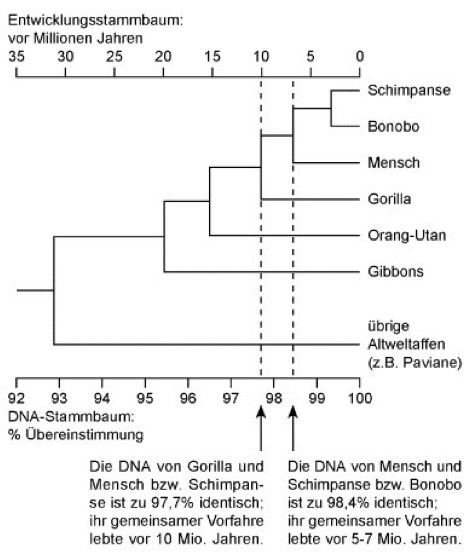 Die klassische zoologische Systematik unterscheidet 2 Menschenaffen-Familien ( vgl. Tab. 1 ): die „Kleinen“ Menschenaffen oder Gibbons (Hylobatidae) und die „Großen“ Menschenaffen (Pongidae). Beide werden zusammen mit der Familie Menschenartige (Hominidae) in der Ordnung Primaten (Herrentiere) zur Überfamilie Hominoidea vereinigt. Diese Klassifikation stützt sich im wesentlichen auf Merkmale, die mit den unterschiedlichen Fortbewegungsweisen (Fortbewegung) der 3 Gruppen zusammenhängen: Gibbons sind spezialisierte „Schwinghangler“ (Brachiatoren; Brachiatorenhypothese), die Großen Menschenaffen ( vgl. Abb. 1 ) bewegen sich auf Bäumen dagegen mit der Methode des Stützhangelns, auf dem Boden vierfüßig (quadruped; Quadrupedie) im sog. Knöchelgang fort, während der Mensch die einzige Art ist, die sich habituell im aufrechten Gang fortbewegt (Bipedie). In Anpassung an diese unterschiedlichen Fortbewegungsweisen hat es zahlreiche, mehr oder weniger auffällige Umkonstruktionen des Skeletts gegeben (Biomechanik). Darüber hinaus unterscheiden sich (rezente) Menschen von sämtlichen Menschenaffen durch ein erheblich größeres Gehirn (Encephalisationsquotient, Gyrifikation, Hirnvolumen, Hominisation), die Fähigkeit zu einer artikulierten Wortsprache (Sprache), ein praktisch nicht mehr vorhandenes Fell (Haarkleid) und eine – im weiblichen Geschlecht – lange postreproduktive Lebensspanne. Daß Menschenaffen und Menschen klar voneinander abgegrenzte Gruppen darstellen, scheint durch diese Befunde also gestützt zu werden. Genetischen Untersuchungen zufolge stellt die traditionelle Unterscheidung zwischen Menschenaffen und Menschen jedoch eine Verzerrung der tatsächlichen Verwandtschaftsverhältnisse dar. Zunächst einmal bestätigten diese Untersuchungen vieles, was man erwartet hatte: Kleine und Große Menschenaffen sind Schwestertaxa (Schwestergruppe), deren Entwicklungswege sich vor etwa 20 Millionen Jahren getrennt haben; die afrikanischen Menschenaffen sind näher miteinander verwandt als mit ihrem asiatischen Vetter, dem Orang-Utan, und Schimpansen und Bonobos sind tatsächlich außerordentlich nahe Verwandte. Die eigentliche Überraschung war jedoch, daß der nächste Verwandte von Schimpanse und Bonobo nicht (wie man lange geglaubt hatte) der Gorilla ist, sondern der Mensch! Die mit der Methode der DNA-Hybridisierung festgestellte genetische Distanz zwischen Schimpansen und Gorillas beträgt 2,3%, die zwischen Schimpansen und Menschen aber nur 1,6% ( vgl. Abb. 2 . und vgl. Tab. 2 ).