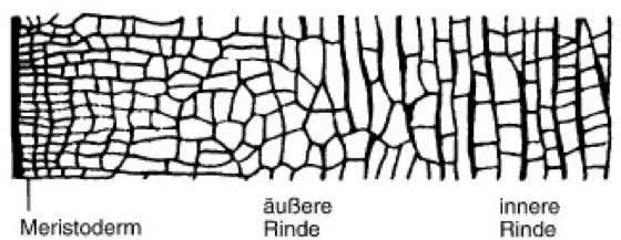 Meristoderms [von *merist- , griech. derma = Haut], Bezeichnung für das sehr teilungsaktive Abschlußgewebe (Epidermis) des Cauloids ( Algen III ) der Braunalgen-Ordnung Laminariales ( vgl. Abb. ). Die Zellen des Meristoderms sind in mehreren Richtungen teilungsfähig, so daß sie tangentiale, radiale und horizontale Zellwände anlegen.