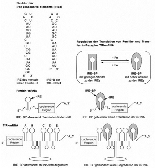 Die Proteine Ferritin und der Transferrin-Rezeptor (TfR) sind beide am zellulären Eisenstoffwechsel beteiligt. Während der Transferrin-Rezeptor für die Übernahme des Eisens vom Transferrin und die Eisenaufnahme in die Zelle zuständig ist, bindet Ferritin überschüssiges Eisen, das sonst toxisch für die Zelle wäre. Die mRNAs für Ferritin und den Transferrin-Rezeptor enthalten beide spezifische Sequenzen (iron responsive elements, Abk. IRE, vgl. Abb.), die eine Haarnadelschleife ausbilden. Diese Strukturen, die im Leader der Ferritin-mRNA und fünffach in der nichttranslatierten 3'-Region (Trailer) der TfR-mRNA vorhanden sind, dienen als Bindestellen für ein spezifisches Protein, das iron responsive element-binding protein (Abk. IRE-BP; auch iron-regulatory-protein-1, IRP-1). Bei Eisenmangel in der Zelle findet eine verstärkte Synthese des Transferrin-Rezeptors statt, um in gesteigertem Maße Eisen aufnehmen zu können. Gleichzeitig ist die weitere Synthese von Ferritin nicht mehr nötig. In dieser Situation bindet das IRE-BP, das jetzt in einer Konformation mit hoher Affinität zu den IREs vorliegt, an die Zielsequenzen im Leader bzw. Trailer der beiden mRNAs. Dadurch wird die mRNA für den Transferrin-Rezeptor vor dem Abbau durch Nucleasen geschützt (durch die Funktionshemmung noch unbekannter, destabilisierender Sequenzen), ihre Stabilität also erhöht, so daß sie länger für die Translation zur Verfügung steht. Im Fall der Ferritin-mRNA bewirkt die Bindung des IRE-BP im Leader, daß das Ribosom nicht mehr von der Cap-Struktur zum Initiationscodon an der mRNA entlanggleiten kann, wodurch die Initiation an der Ferritin-mRNA blockiert wird. Neuere Untersuchungen deuten darauf hin, daß IRE-BP dabei den für die Proteinsynthese erforderlichen engen Kontakt der mRNA zum Ribosom verhindert. Liegt ein Überangebot an Eisen vor und wird daher viel Ferritin benötigt, sinkt die Konzentration von IRE-BP. Dessen Platz an der mRNA bleibt leer, ein anderes Protein (eIF-3, Initiationsfaktoren) kann dort binden und die Interaktion mit dem Ribosom und damit die Translation der Ferritin-mRNA gewährleisten. Die TfR-mRNA dagegen wird bei sinkender Konzentration von IRE-BP degradiert.