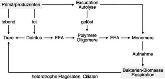 Modell des microbial loop. Angegeben sind die Wege der Transformation organischer Substanz von den Primärproduzenten zu den Bakterien unter Beteiligung extrazellulärer Enzymaktivitäten (EEA)