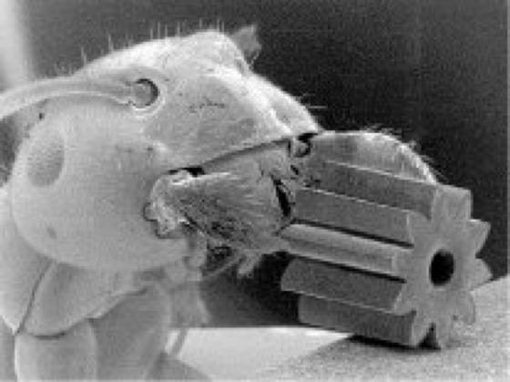 Rasterelektronenmikroskopische Aufnahme eines Zahnrads (Durchmesser 514 μm) aus einem Mikroplanetengetriebe mit dem Kopf einer Ameise.