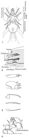 1 Körpergliederung; 2 Schnitt durch das Gnathosoma; 3 verschiedene Chelicerentypen. 4 Paarung der Milbe Arrenurus globator: Die Spermatophore ist mit einem Sekretstiel am Untergrund befestigt. Das Männchen trägt das mit einer Kittsubstanz am Rücken festgeklebte Weibchen über die Spermatophore, damit das Samenpaket in die weibliche Geschlechtsöffnung aufgenommen werden kann.