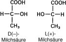 Milchsäure, Hydroxypropionsäure, in der optisch aktiven L-Form (Isomerie, optische Aktivität; ä vgl. Abb. ) eine in allen Organismen als zentrales Stoffwechselprodukt, besonders als Endprodukt der anaeroben Glykolyse (Farbtafel) und als Ausgangsprodukt der Gluconeogenese, vorkommende Hydroxycarbonsäure (Anaerobiose; Dissimilation II ). Die Salze und Ester der Milchsäure sind die Lactate. In reiner Form ist Milchsäure eine ölige, wasseranziehende, ätzende Flüssigkeit, verdünnt mit Wasser ist sie von angenehm saurem Geschmack. Sie bildet sich durch die Tätigkeit von Milchsäurebakterien beim Sauerwerden von Milch (Sauermilchprodukte, Käse) und der Säuerung von anderen Nahrungsmitteln und Futtermitteln (z.B. Sauerkraut und Gärfutter; Gärung, Milchsäuregärung, Silage). Im arbeitenden Muskel (Muskelkontraktion) kann sich der Milchsäurespiegel der umgebenden Blutgefäße durch verstärkten Abbau von Glykogen von 5 mg auf 100 mg pro 100 ml erhöhen (sog. Fleischmilchsäure). Berzelius (J.J. von), Embden (G.), Ernährung, Lactat-Dehydrogenase (Abb.), Leichenstarre, Liebig (J. von), Malo-Lactat-Gärung, Meyerhof (O.F.), Mitscherlich (E.A.), Scheele (K.W.), Vaginalflora, Virtanen (A.I.), Wislicenus (J.A.); Kohlenstoff .