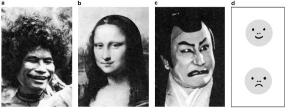 Abb. 1: Die menschliche Mimik bildet ein außerordentlich differenziertes Ausdrucksverhalten, das großenteils der sozialen Kommunikation dient. Zum Teil enthält der mimische Ausdruck sehr einfache Auslöser (Schlüsselreize), die von allen Menschen, auch von kleinen Kindern, sofort verstanden werden: Von den drei Gesichtern (a–c) aus ganz verschiedenen Kulturen werden die beiden ersten als freundlich, letzteres als aggressiv oder abweisend empfunden. Wie das Schema d zeigt, wirken dabei ganz einfache Reizkonfigurationen mit, auch die vereinfachten Strichzeichnungen werden sofort richtig eingeordnet. Die echten Gesichter vermitteln darüber hinaus aber noch viele weitere Informationen, z.B. durch die Blickrichtung, das Entblößen oder Verbergen der Zähne usw.