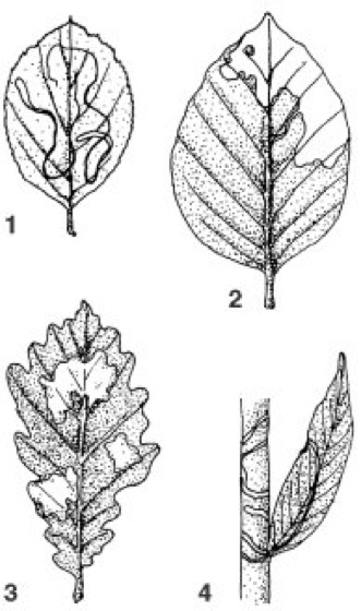 1 Gangmine der Schlangenminiermotte (Lyonetia clerkella);2 Platzmine des Buchenspringrüßlers (Rhynchaenus fagi);3 Blasenmine der Eichenminiermotte (Tischeria complanella);4 Stengelmine der Schneckenmotte Phyllocnistis saligna