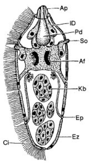 Miracidium-Larve des Großen Leberegels (Fasciola hepatica), Cilien auf der rechten Seite weggelassen. Af Augenfleck, Ap Apikalpapille, Ci Cilium, Ep Exkretionsporus, Ez Epithelzelle, Kb Keimballen, lD laterale Drüse, Pd „Penetrationsdrüse“, So Seitenorgan