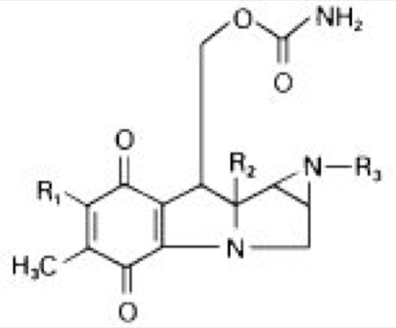 Mitomycine [von *mito- , griech. mykēs = Pilz], von Streptomyces caespitosus und Streptomyces verticillatus (Streptomycetaceae) produzierte bakterizide und cytotoxische Antibiotika, die gegen grampositive und gramnegative Bakterien, Mykobakterien, Viren, Askariden (Ascaridida, Spulwurm) und Rickettsien wirken. Sie enthalten Strukturelemente, die auch in synthetischen Alkylantien vorhanden sind, z.B. den Aziridinring und den Carbamidsäureester-Rest. Sie wirken als bifunktionelle Alkylantien. Von den Mitomycinen A, B und C ( vgl. Abb. ) ist Mitomycin C am besten untersucht. Es inhibiert die DNA-Synthese (Replikation), da es die beiden DNA-Stränge durch alkylierende Reaktionen kovalent quervernetzt (Alkylgruppe, alkylierende Substanzen) und bildet freie Radikale. Trotz relativ hoher Toxizität (LD50 = 1,0–2,5 mg/kg Ratte parenteral; Dosis) wird Mitomycin zur Behandlung von Karzinomen (insbesondere des Pankreaskarzinoms), Sarkomen, Lymphomen, Leukämie und Hodgkinscher Krankheit (Krebs) eingesetzt. Matrizenblocker.
