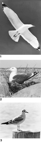 1 Nordamerikanische Ringschnabelmöwe (Larus delawarensis),2 Mantelmöwe (Larus marinus), brütend; 3 Lachmöwe (Larus ridibundus)