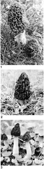 1 Speisemorchel (Morchella esculenta Pers.),2 Spitzmorchel (Morchella conica Pers.), 3 Käppchenmorchel (Morchella rimosipes DC)