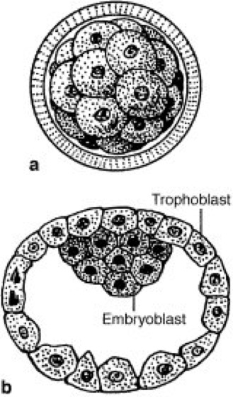Morula und b Medianschnitt durch die Blastocyste eines Säugers (Mensch)
