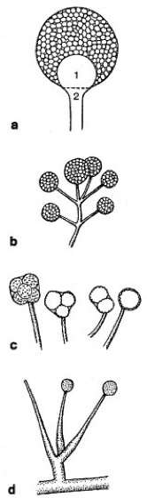 a echtes Sporangium mit Columella (1) und Apophyse (2) und vielen Sporangiosporen bei Rhizopus; ohne Erweiterung des Sporangienträgers (= Apophyse) bei Mucor; b Büschel von Sporangien ohne Columella mit zahlreichen Sporangiosporen bei Mortierella biramosa; c kleines, nur wenige Sporangiosporen oder sogar nur 1 Sporangiospore enthaltendes Sporangium (= Sporangiole) bei Mortierella angusta; d einsporige Sporangiolen, die samt der Sporangienwand abfallen (daher auch als „Konidien“ bezeichnet), bei Haplosporangium fasciculatum