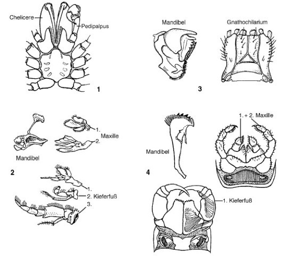 Mundwerkzeuge 1 einer Spinne (Bauchseite), 2 des Flußkrebses (linke Mundwerkzeuge), 3 eines Doppelfüßers, 4 der Hundertfüßer