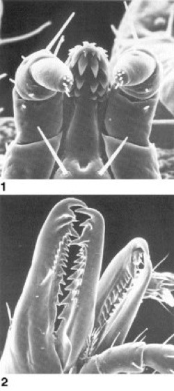 REM-Aufnahmen von Mundwerkzeugen 1 einer Zecke, 2 einer Raubmilbe