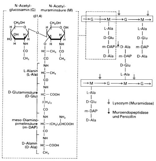Aufbau des Mureins und Art der Verknüpfung der heteropolymeren Muropolysaccharidketten durch kurze Peptidketten (senkrechte Pfeile = Angriffspunkte von Enzymen, z.B. Lysozym, und Penicillin). Die sich wiederholende Grundeinheit (linker Teil der Abb.) wird als Muropeptid (eigentlich wegen der Zuckerreste korrekter Muroglykopeptid) oder Muropeptideinheit bezeichnet. Sie bildet sich aus Murein durch Einwirkung von Lysozym und Muroendopeptidase.