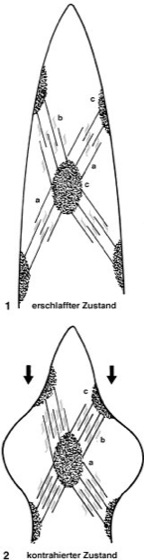 In den glatten Muskelzellen liegen die Actinfilamente (a) zwar in kleinen Bündeln parallel ausgerichtet vor, doch verlaufen diese Bündel nicht parallel zueinander. Sie bilden vielmehr, da sie durch ellipsoide Befestigungsplatten (Z-Knoten; c) miteinander und mit dem Plasmalemma verbunden sind, ein dreidimensionales Netz um das Zentral- oder Endoplasma mit Kern (nicht eingezeichnet). Zwischen den Bündeln von Actinfilamenten liegen im erschlafften (1) Zustand nur wenige, im kontrahierten (2) Zustand aber bedeutend mehr, im Vergleich zu Skelettmuskelfasern viel kürzere Myosinfilamente (b). Nach dem zum Teil noch hypothetischen Modell des Kontraktionsmechanismus gleiten die Actinfilamente weiter zwischeneinander, wobei sie von den kurzen Myosinfilamenten wie Zahnstangen von einem Zahnrad gegeneinander bewegt werden. Über die Befestigungsplatten wird diese Bewegung auf die ganze Zelle übertragen (2).