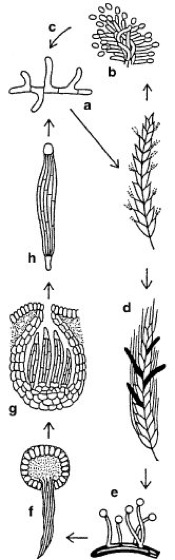 Entwicklung der Mutterkornpilze: Ascosporen gelangen im Frühjahr an Narben von Roggen sowie von Wildgräsern und keimen. Es bilden sich Hyphen (a), die in den Fruchtknoten eindringen, ihn unter Zerstörung des Gewebes durchwuchern und in eine dichte Mycelmasse umwandeln. Am Mycel entstehen nach kurzer Zeit Konidien in großen Massen (b). Gleichzeitig wird eine süße Flüssigkeit (Honigtau) zum Anlocken von Insekten ausgeschieden, welche die äußerlich haftenden Konidien auf andere Blüten übertragen, wo diese keimen und Infektionshyphen bilden (c). Aus dem Mycel wächst später, wenn die nicht befallenen Fruchtknoten zu Samen reifen, das Pilzmycel in die Länge und bildet ein weit aus der Ähre ragendes, hornartiges, dunkelpurpurfarbiges, pseudoparenchymatisches Sklerotium, das Mutterkorn (beim Roggen bis 4 cm lang, d). Die zur Erntezeit auf den Boden fallenden oder mit ungereinigtem Saatgut ausgesäten Sklerotien keimen im folgenden Frühjahr mit zahlreichen gestielten, köpfchenförmigen, purpur bis violett gefärbten Stromata aus (e). In jedem Stromaköpfchen (f) entstehen viele flaschenförmige, eingesenkte Perithecien (g), deren Bildung durch Kopulation zwischen mehrkernigem Ascogon und Antheridien eingeleitet wird. Aus den paarkernigen, ascogenen Hyphen entwickeln sich lange, dünne, diploide Asci (h), in denen durch Reduktionsteilung die fädigen Ascosporen gebildet werden.