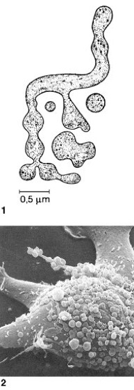 1Mycoplasma-Zellen; 2 rasterelektronenmikroskopische Aufnahme einer mit Mycoplasmen infizierten Mäusenierenzelle